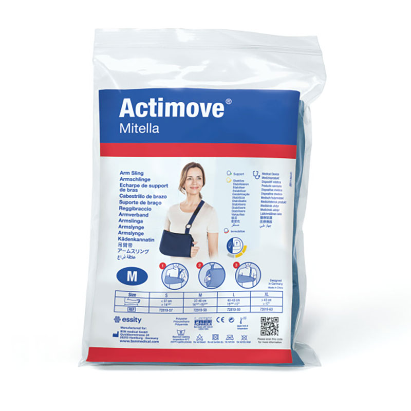 Actimove Mitella Eco Arm Sling is a comfortable and easy-to-use arm support. The sling can be easily adjusted using hook and loop fasteners. The sling supports the injured upper extremity and features non-stretch foam material for secure clinical positioning of the arm. The sling pouch is lightweight and has a soft neck strap for enhanced comfort. By inserting the thumb into the built-in soft thumb loop, the arm is prevented from slipping out of position. Available in 4 sizes.