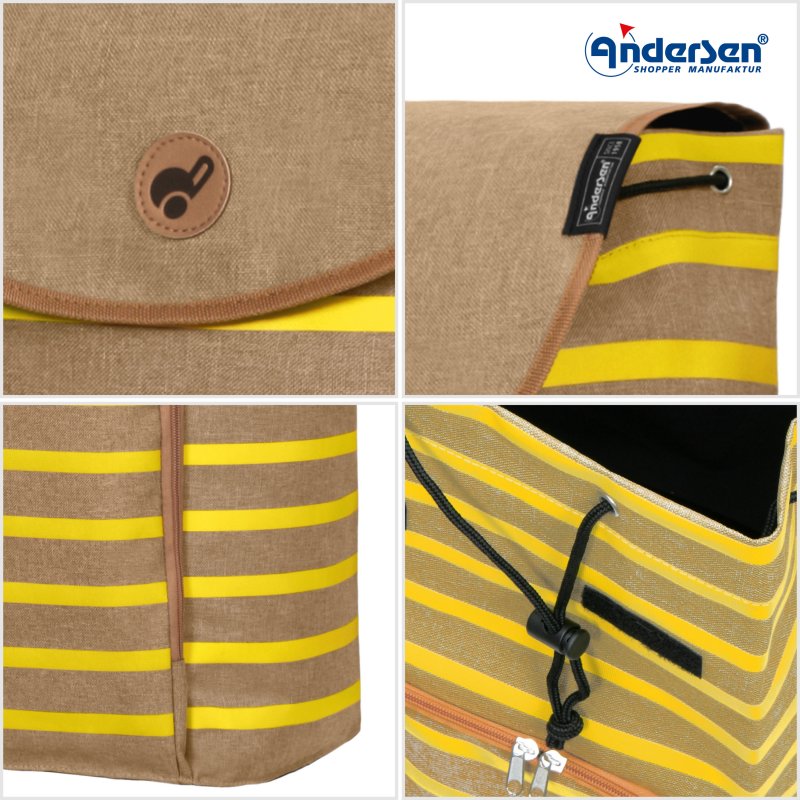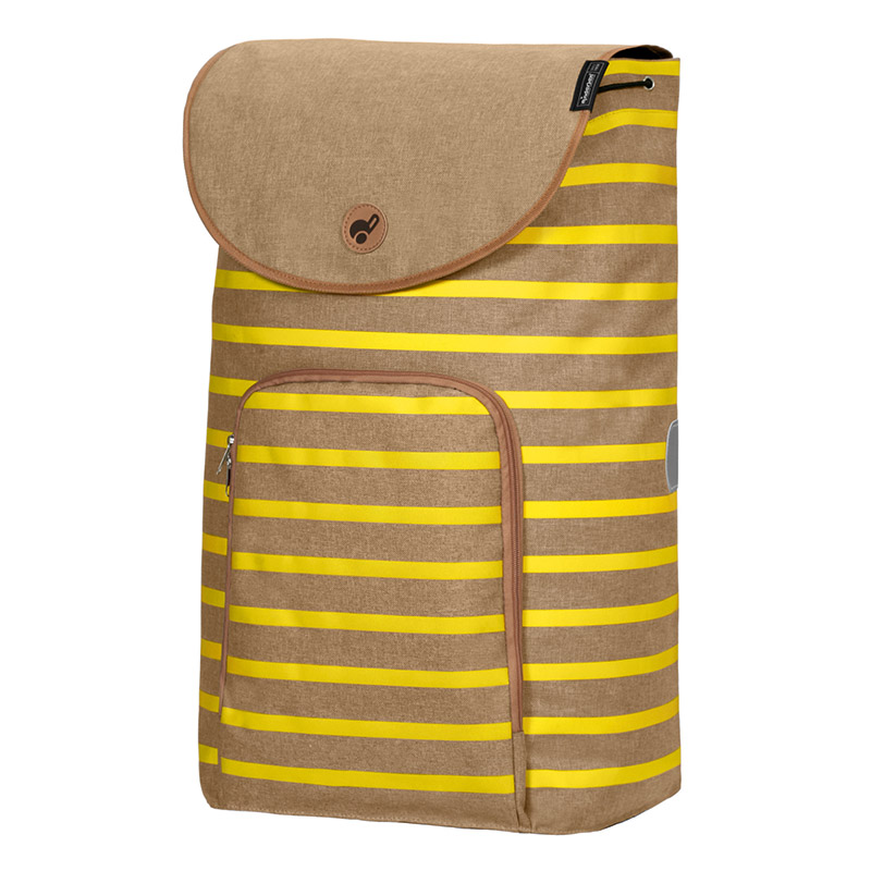 The Andersen Shopping Trolley Bag Eske Yellow is a colorful and stylish bag. With its delightful stripes, it adds a cheerful touch to your everyday life. The bag is water-repellent and has a capacity of 47 liters. With front and interior compartments, it has space for most things you might need. Under the round lid, the bag can be completely closed with a drawstring for added security. Smart reflective elements make you visible in the dark, and when not in use, the bag can be completely flattened.