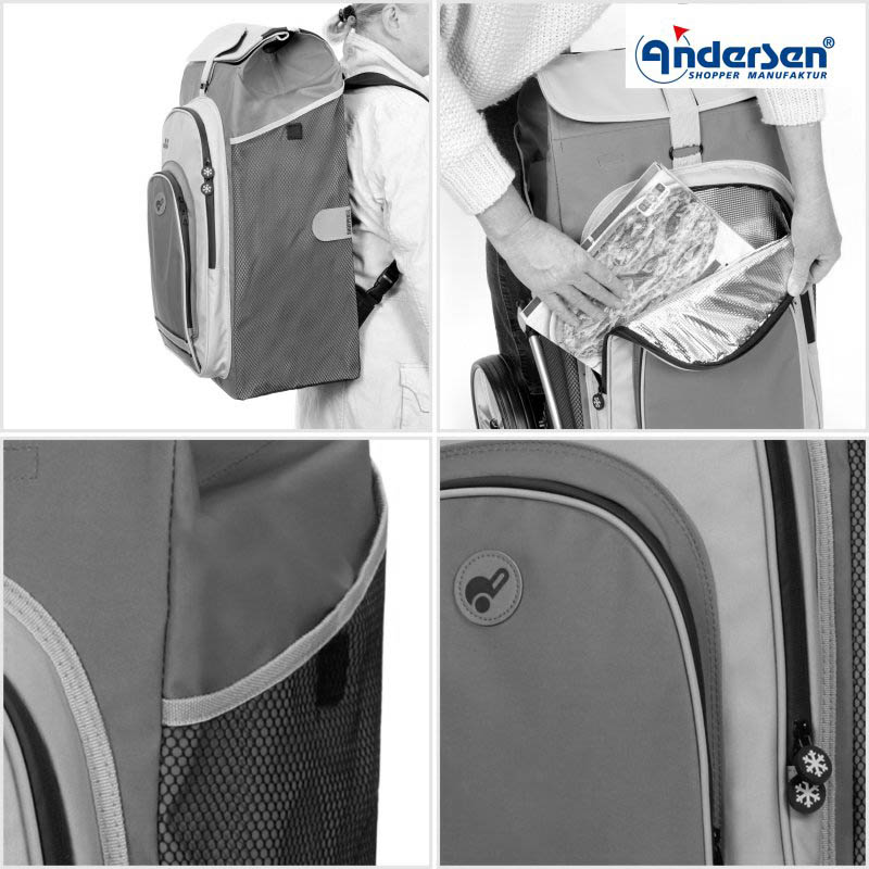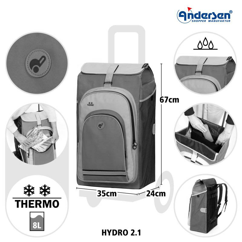 The Andersen Shopping Trolley Royal Hydro 2.1 with 25 cm Ball Bearing Wheels is a robust trolley designed for heavy loads. The Andersen Royal chassis can carry up to 50 kg and features a Hang-fix system that allows attachment to shopping carts.