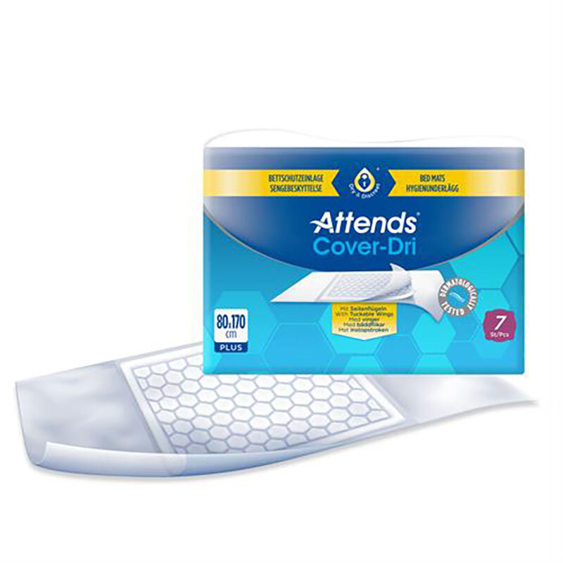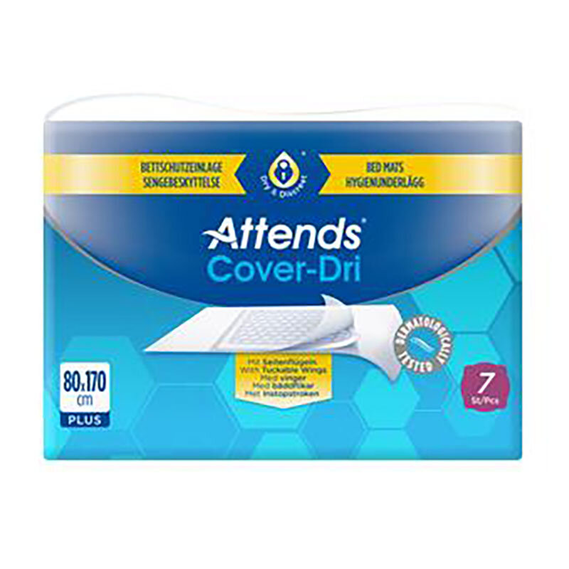 Attends Cover Dri Plus 80×170 cm 7-pack is an absorbent hygiene underpad designed for use in beds, chairs, and wheelchairs as a complement to incontinence protection where there is a risk of leakage. The underpad can also be used after clinical procedures or as a protective layer under regular bedsheets when training children to become diaper-free at night.