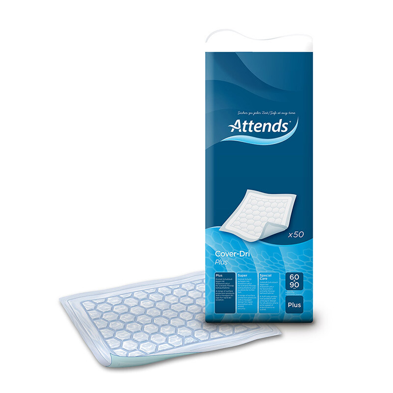 Attends Cover Dri Plus 60×90 cm is an absorbent hygiene underpad designed for use in beds, chairs, and wheelchairs as a complement to incontinence protection where there is a risk of leakage. The underpad can also be used after clinical procedures or as protection under regular sheets when training children to become diaper-free at night.