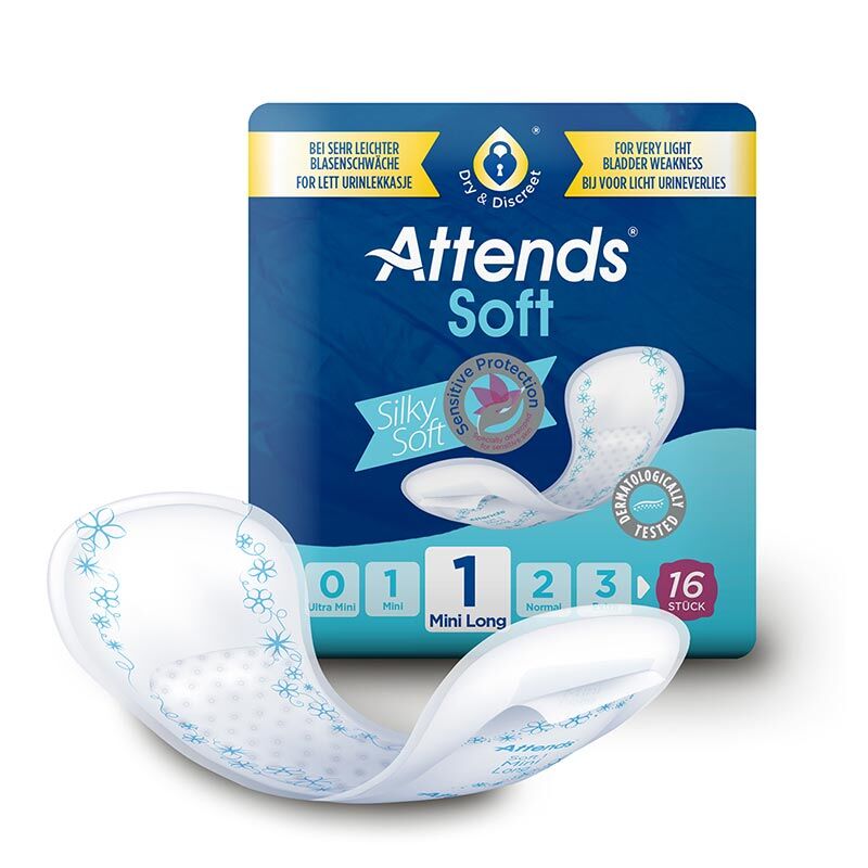 Attends Soft Mini 1 Long is an anatomically shaped pad for light urinary and drip incontinence. Attends Soft 1 Long has a silky-soft and skin-friendly surface specially developed for sensitive skin.