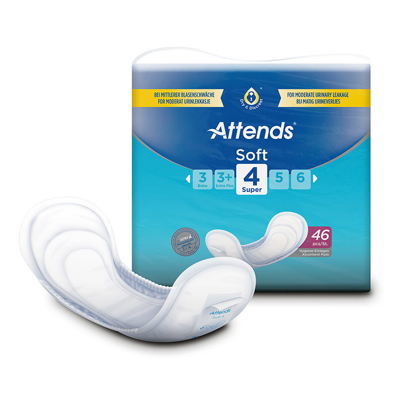 Attends Soft 4 Super is an anatomically shaped pad for moderate urinary incontinence. Attends Soft 4 Super has a silky-soft and skin-friendly surface specially developed for sensitive skin.