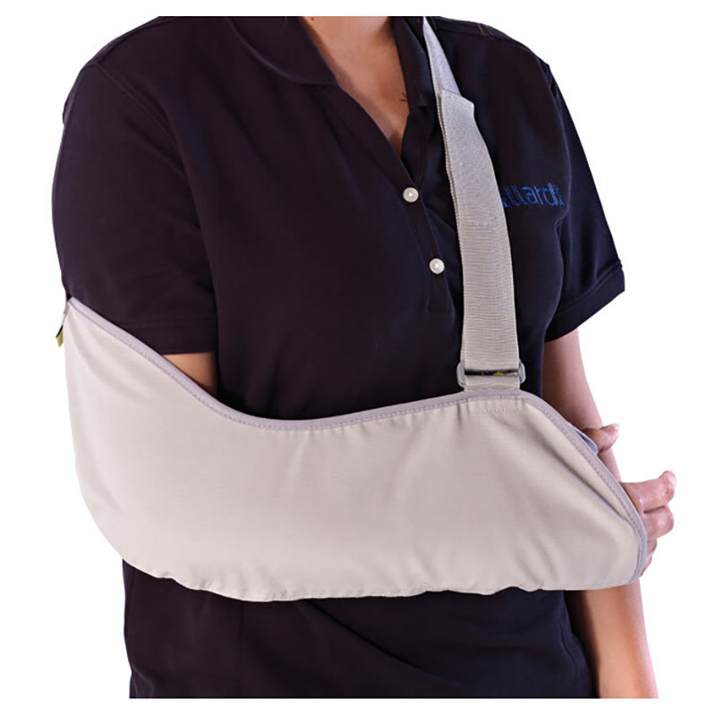 The arm sling has an infinitely adjustable shoulder strap that is easy to adapt for people of different sizes and shapes. The shoulder strap also has removable padding that can be positioned to maximize comfort and reduce shoulder pressure.