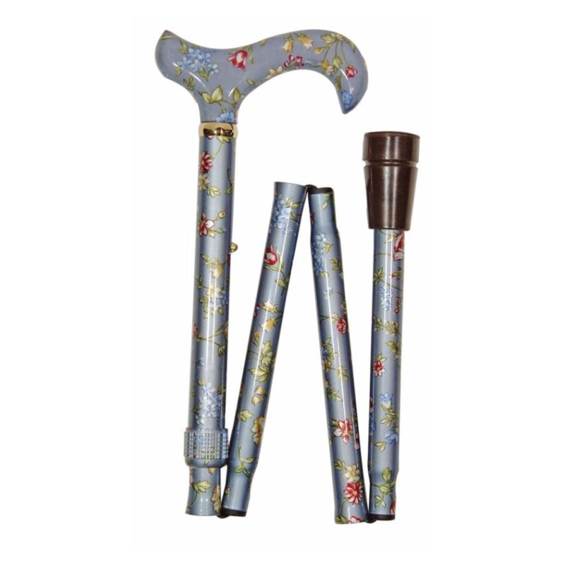 The Classic Canes Folding Cane Grey Blue Flower combines elegance with stability in a practical walking aid. This versatile cane folds easily into 4 sections for convenient storage when visiting restaurants or traveling by car. The folded cane can be safely stored in a suitable carrying case.