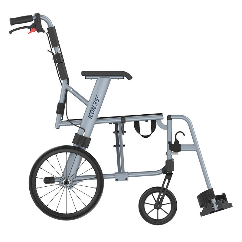 Icon 35 has 14-inch solid puncture-proof tires made of polyurethane. The wheelchair features a cross-frame construction allowing it to fold compactly for easy storage and transport.