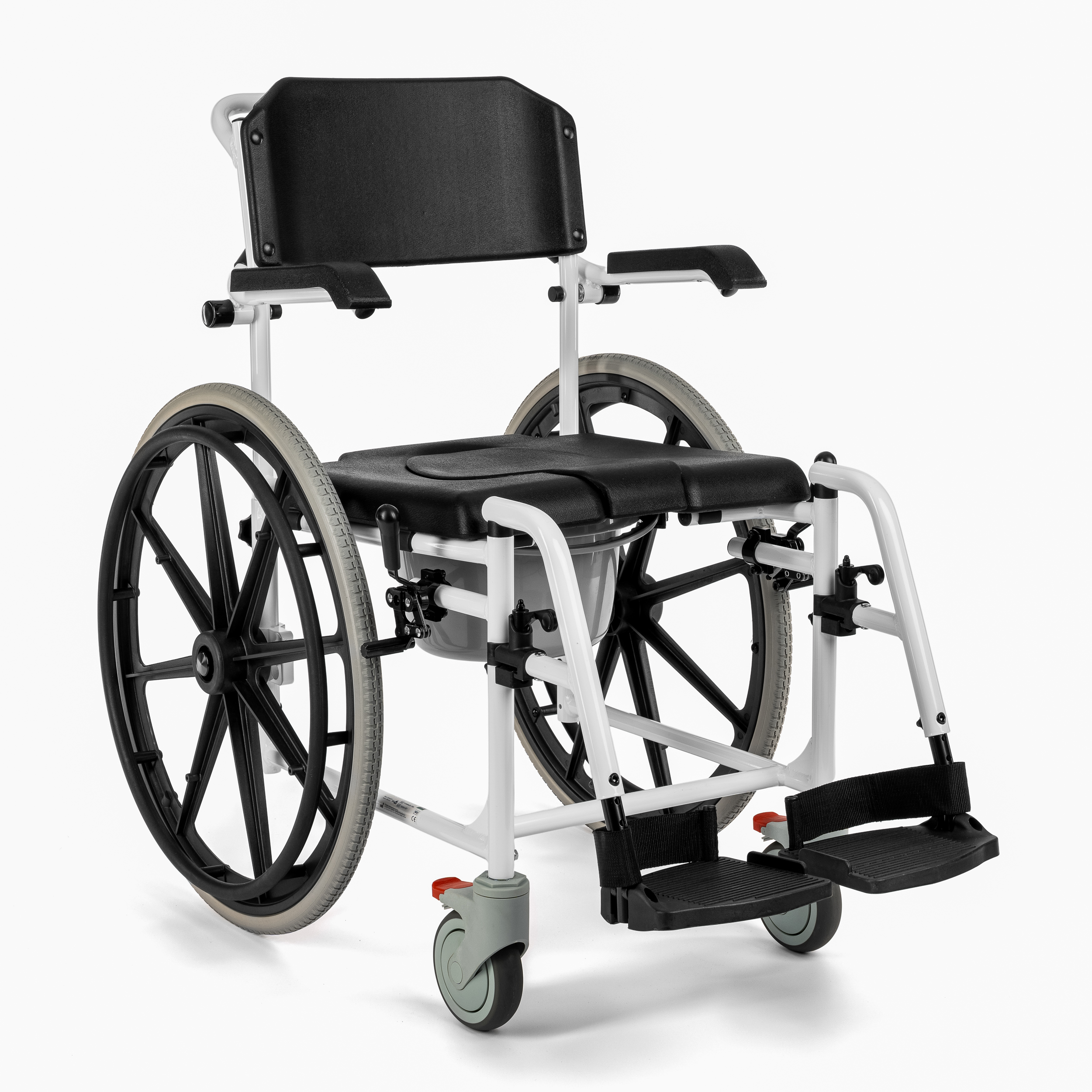 The Timago Commode and Shower Chair Complex Tim is specially designed for individuals with reduced mobility who need support during daily hygiene activities. This wheelchair combines the functionality of a shower chair and commode chair thanks to the sanitary container/potty under the seat and the moisture-resistant aluminum frame.