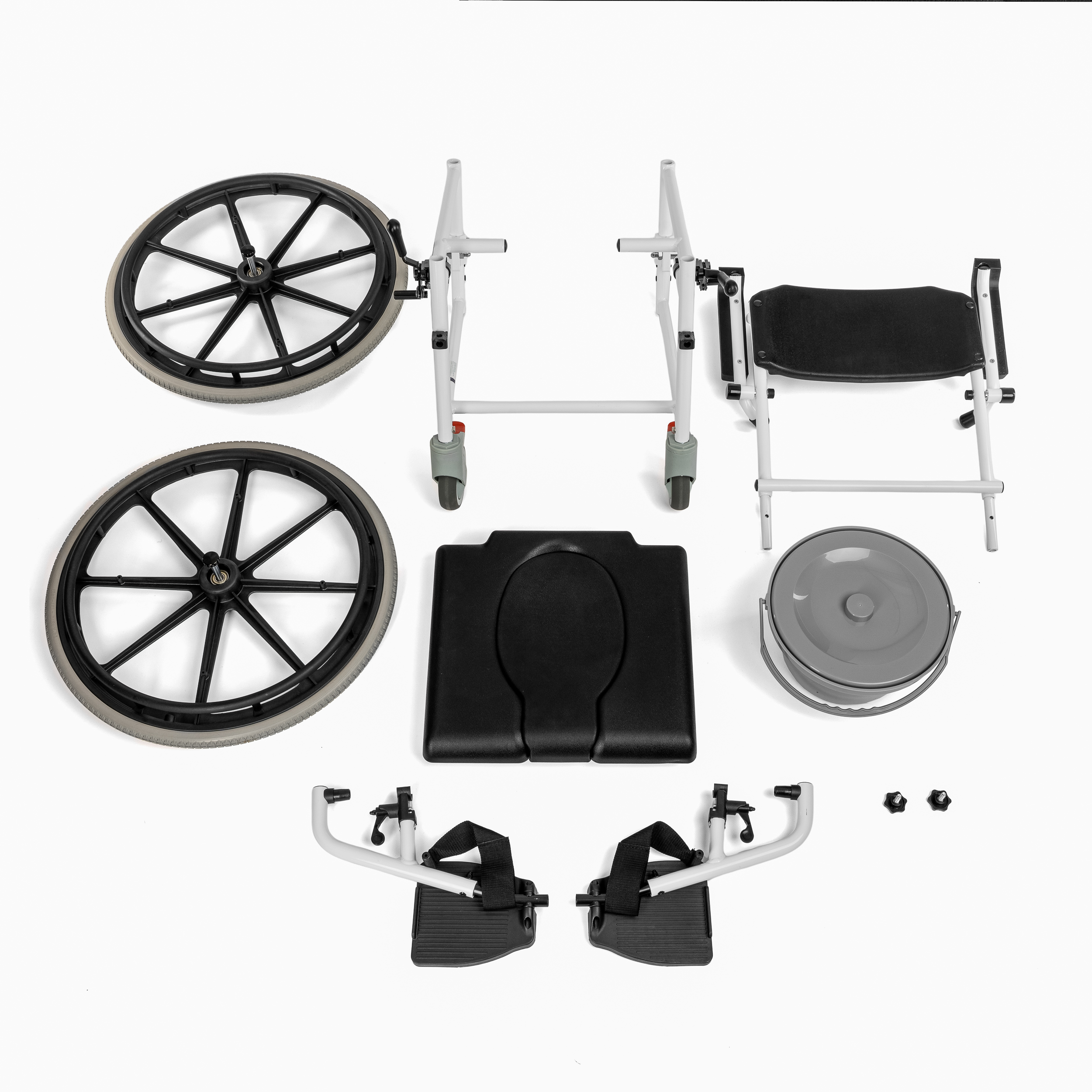 Package includes: Wheelchair frame with wheels, seat, two mounting buttons, right and left footrests with safety straps, and sanitary container with lid.