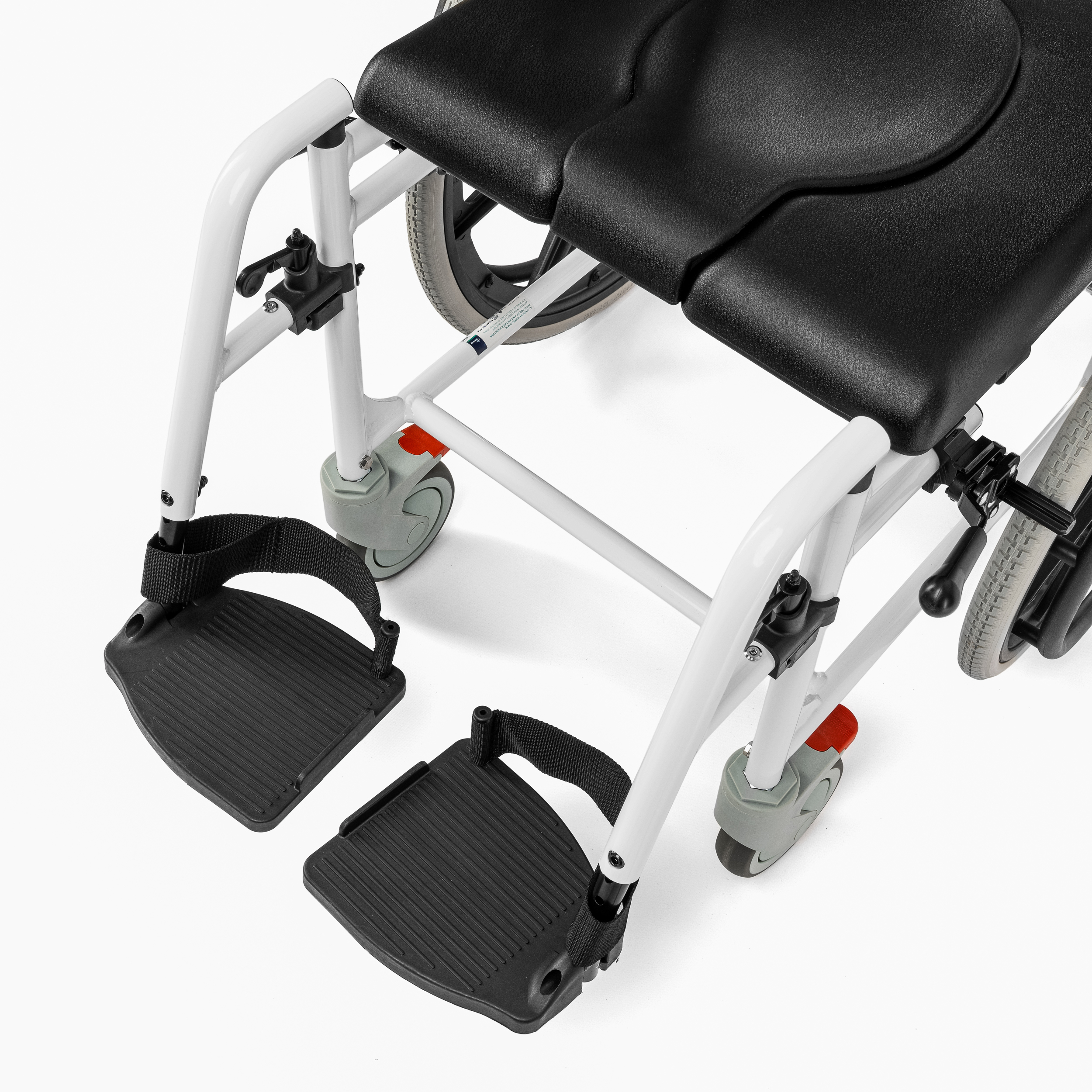 - Angle-adjustable and removable footrests with safety straps