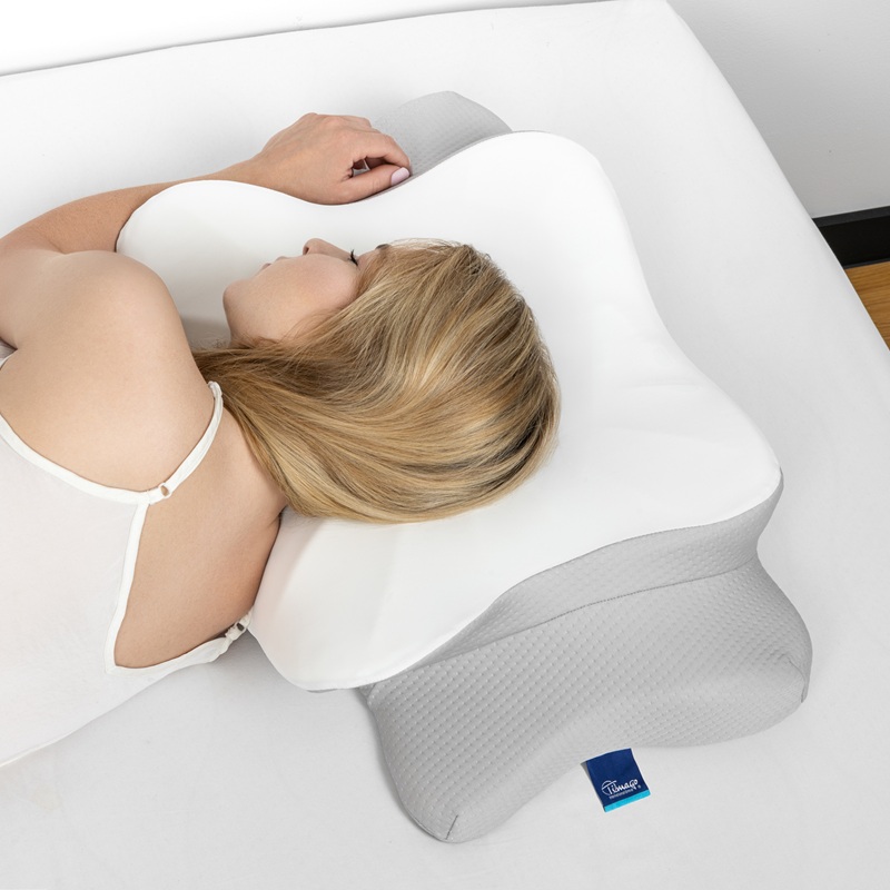 The Timago CPAP Pillow SLEEP BUDDY is an orthopedic pillow developed specifically for those who use a CPAP machine and prefer to sleep on their side. The unique anatomical shape with specially formed side cutouts enables comfortable positioning of the head while the CPAP mask stays comfortably in place without pressure or displacement during the night. This Timago CPAP Pillow SLEEP BUDDY provides optimal support for individuals undergoing CPAP treatment.