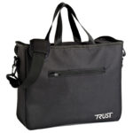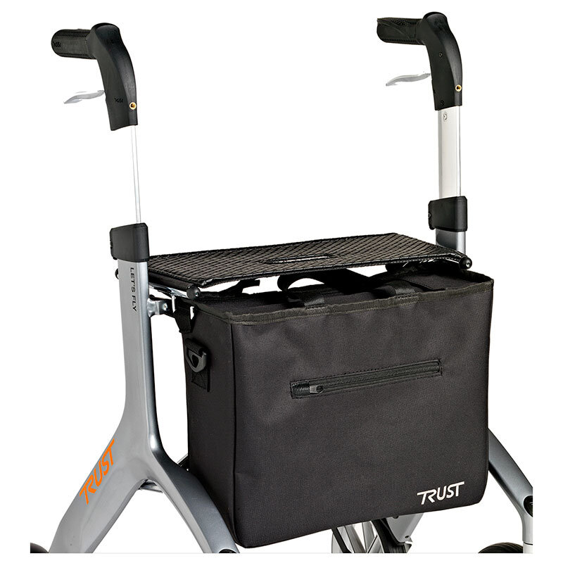 The Trust Care Bag Let’s Fly is a smart bag for the Let’s Fly rollator. The bag is made of black canvas and attaches to two hooks just under the seat of the rollator. The bag is spacious and equipped with a zipper for secure storage. There is a smaller pocket at the front, also with a zipper. The bag can be quickly and easily attached and detached from the mounts and can be used as a bag even without the rollator.