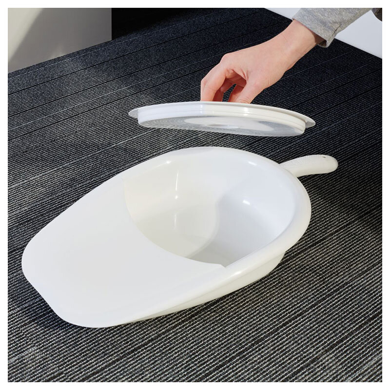The bedpan is equipped with handles and a lid for easy carrying and emptying.