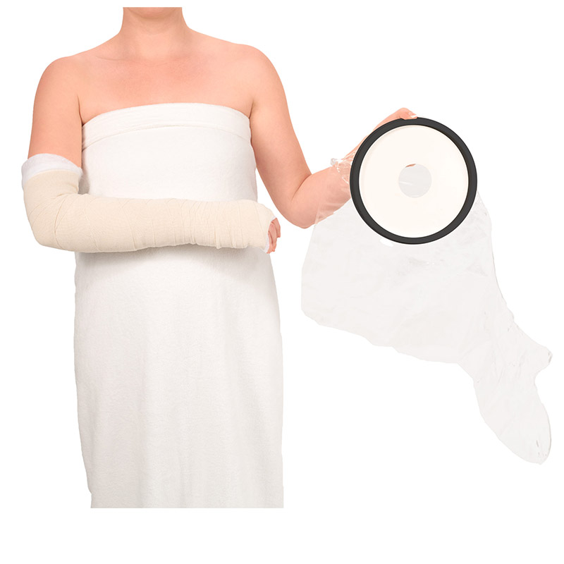 The Vitility Shower Protection Full Arm protects casts or bandages on the entire arm when showering or bathing. The elastic opening ensures water doesn’t enter inside the protection. The shower sleeve, or shower sock as it’s also called, is light and easy to put on and take off.